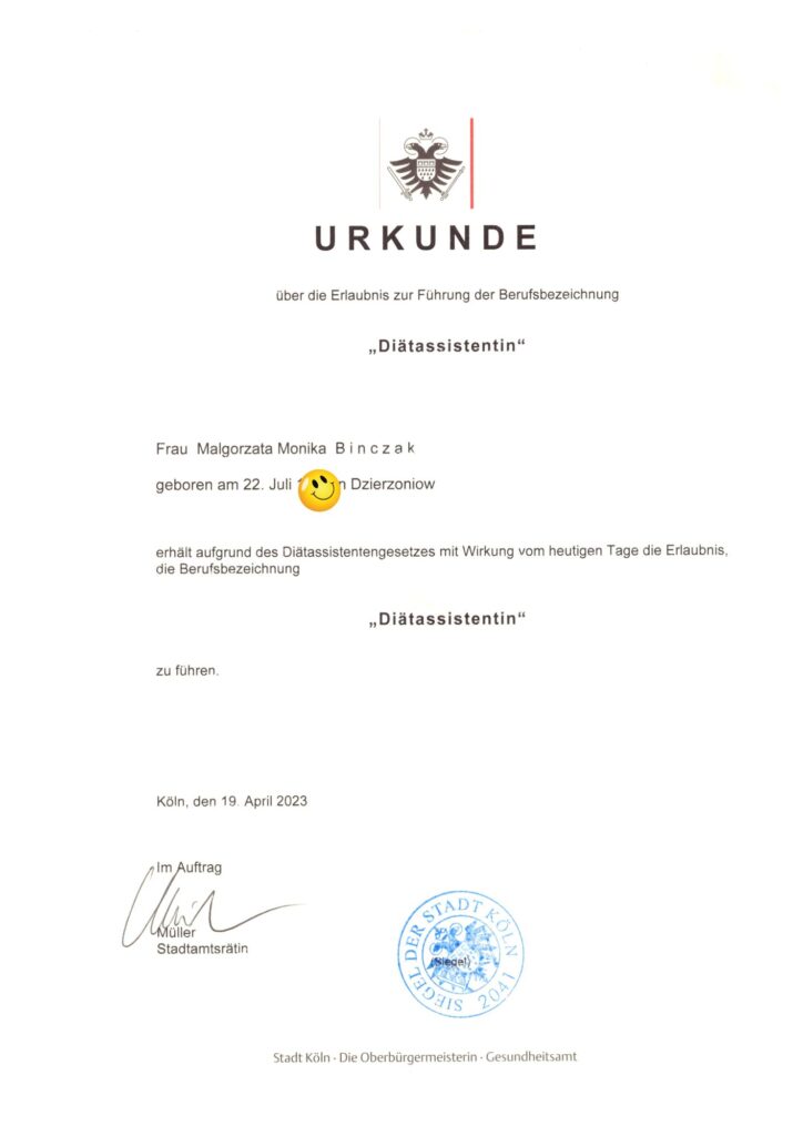 Połączenie tych dyplomów i wysłanie do niemieckiego urzędu do spraw uznawania wykształcenia i kwalifikacji zawodowych zostało pozytywnie zatwierdzone jako;